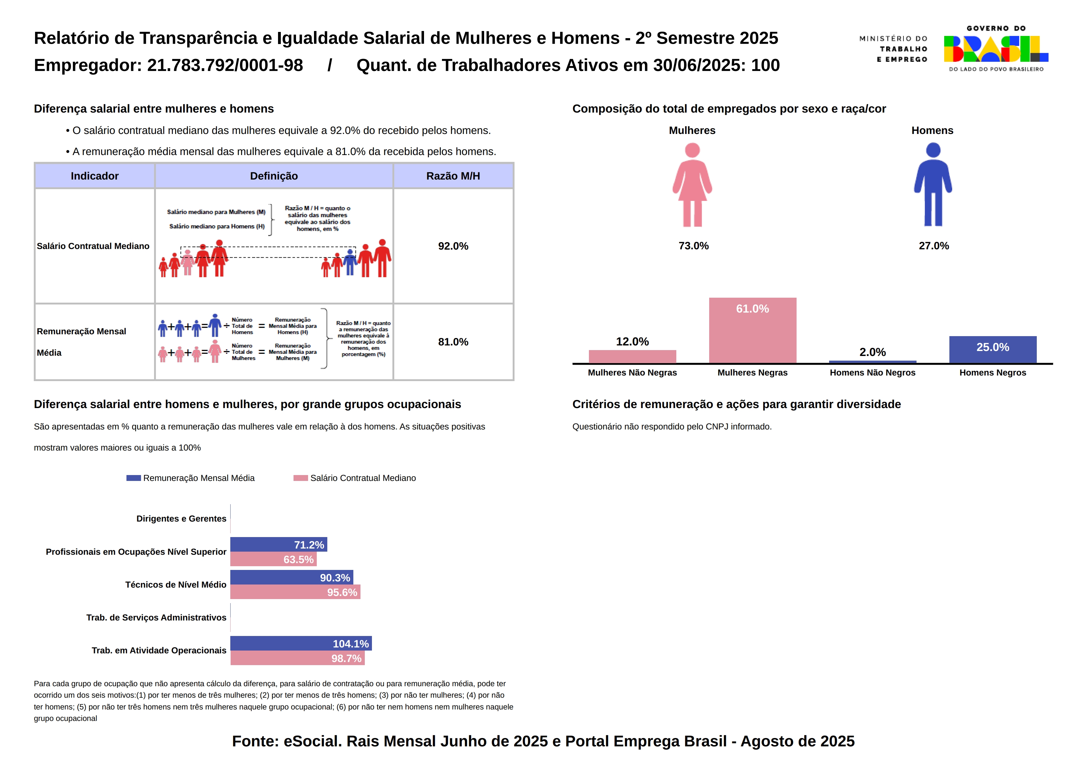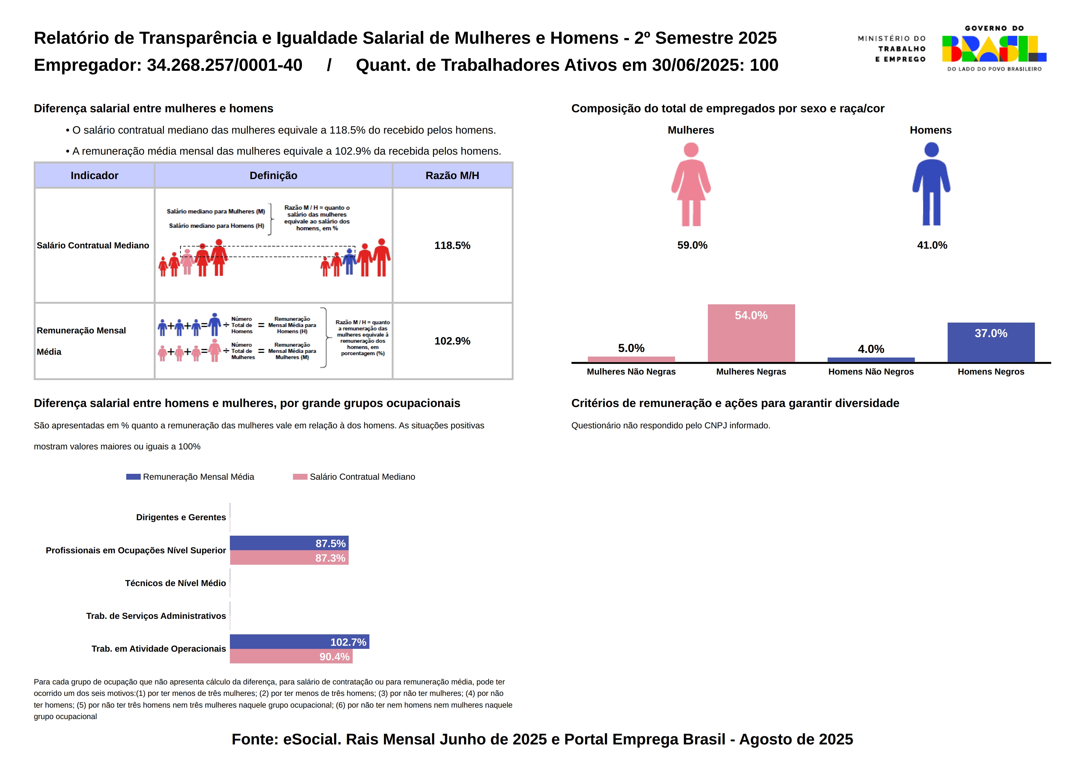 Este relatório apresenta informações sobre remunerações e critérios adotados, garantindo transparência e conformidade com a legislação vigente e reafirmando nosso compromisso com um ambiente de trabalho ético, inclusivo e equitativo.
